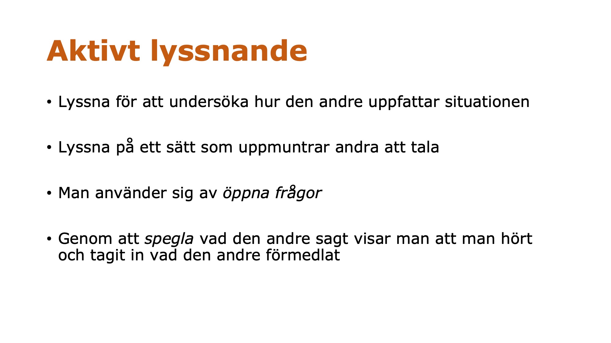 Vi talade också om förmågan att lyssna. Aktiv lyssning är en viktig förmåga i ett samtal. Aktiv lyssning och spegling handlar om detta (två presentationsbilder efter varandra). Öppna frågor inbjuder den andre till att utforska sin situation och att sätta egna ord på sina tankar och känslor.