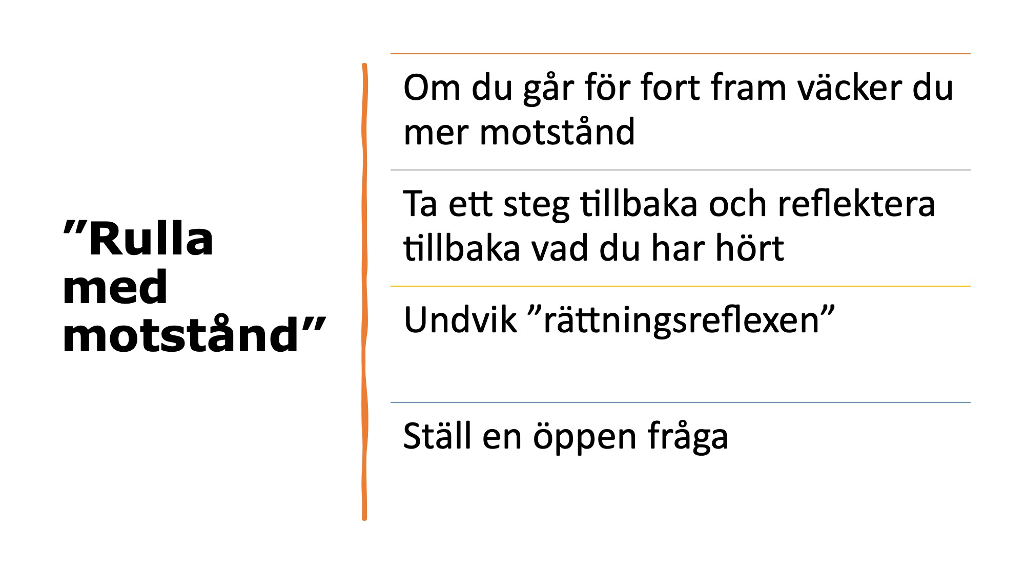 Vi berörde motiverande samtal och listade följande aspekter: